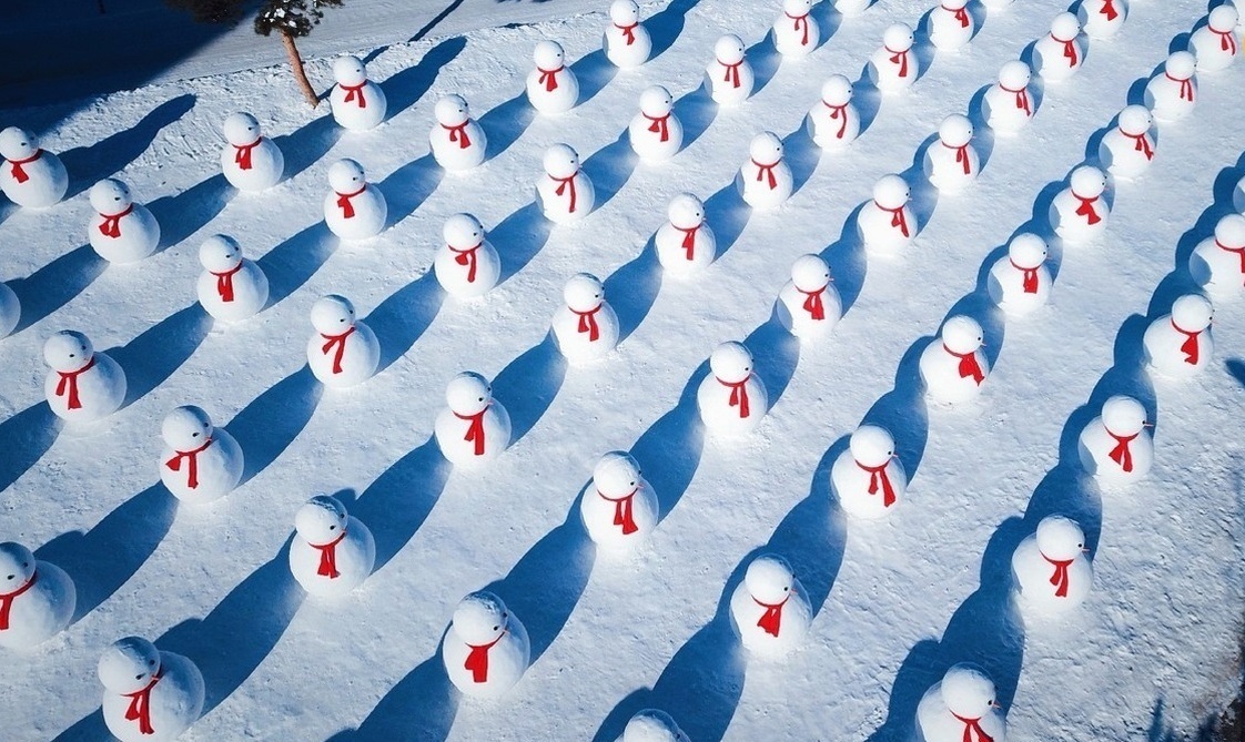 آدم برفیهای ساخته شده همه در یک اندازه و یک شکل هستند و سبب شده اند بازدید کنندگان زیادی از آنها دیدن کنند.